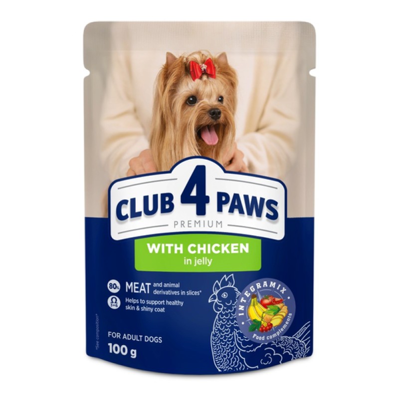 Club 4 Paws Premium Adult Dog Small Breeds with Chicken Jelly — повноцінний вологий корм преміум-класу для дорослих собак дрібних порід. Ніжні шматочки курки у м’якому желе чудово смакують навіть вибагливим улюбленцям та легко засвоюються.